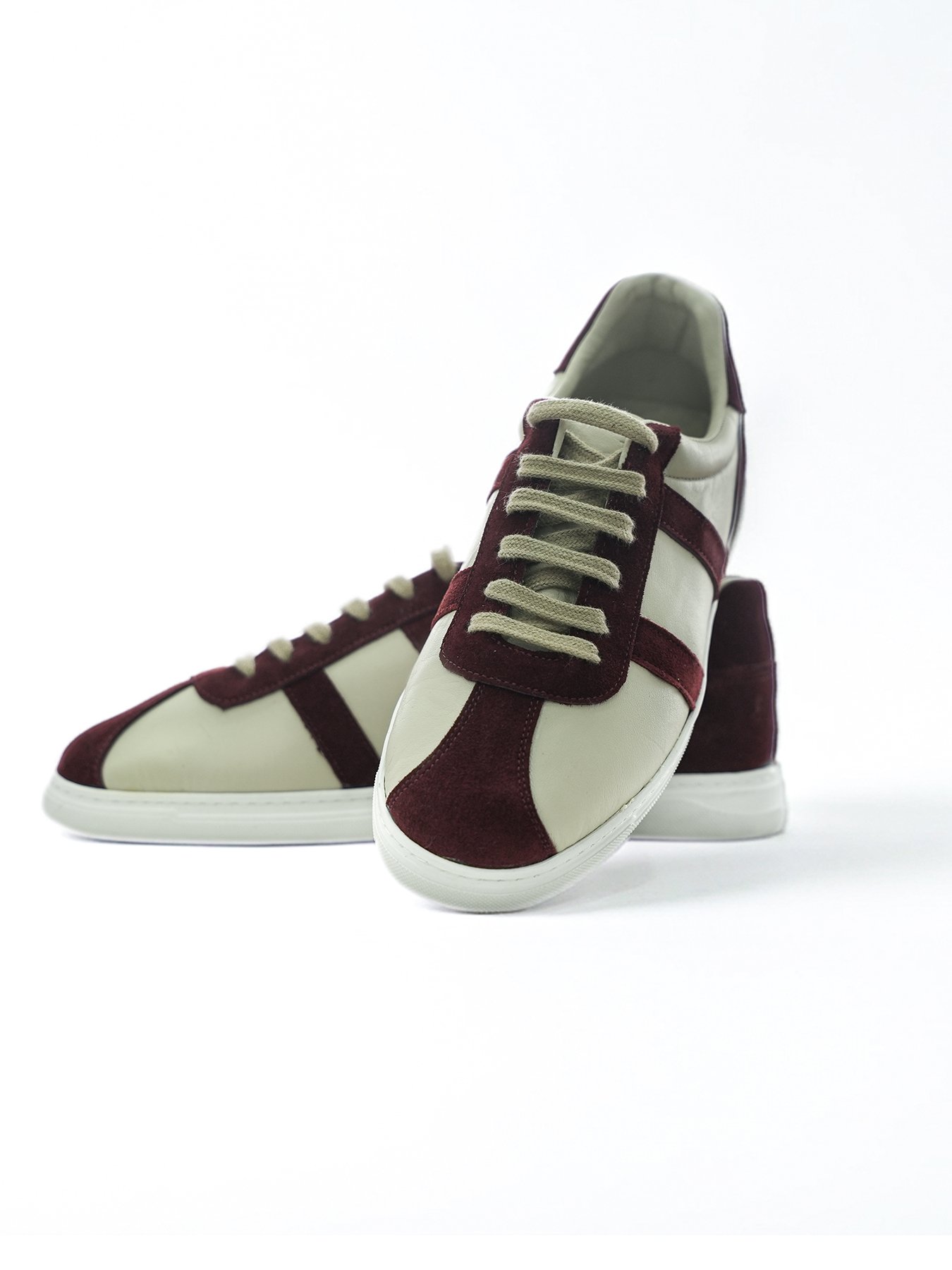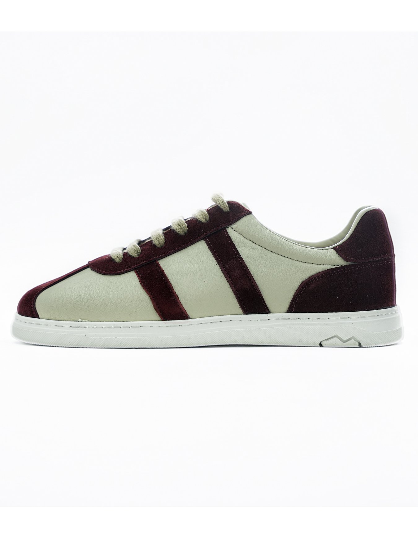 Üretiminde kullanılan birinci sınıf pürüzsüz deri, yumuşak dokusuyla ayağınızı nazikçe sarar. Burun, topuk ve yan şeritlerdeki bordo süet paneller, ayakkabıya zengin bir dokusal kontrast katar. Tasarımın altını çizen beyaz kauçuk taban, hem ürüne ferah bir görünüm kazandırır hem de sportif bir duruş sergiler. Kalın ve dokulu bağcıklar, gövde rengiyle uyum sağlayarak bütünlüğü korur.