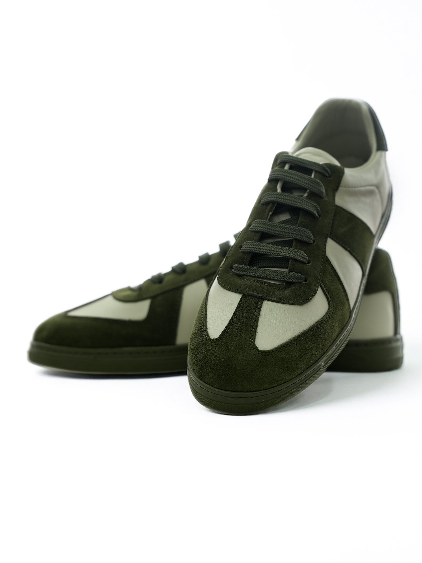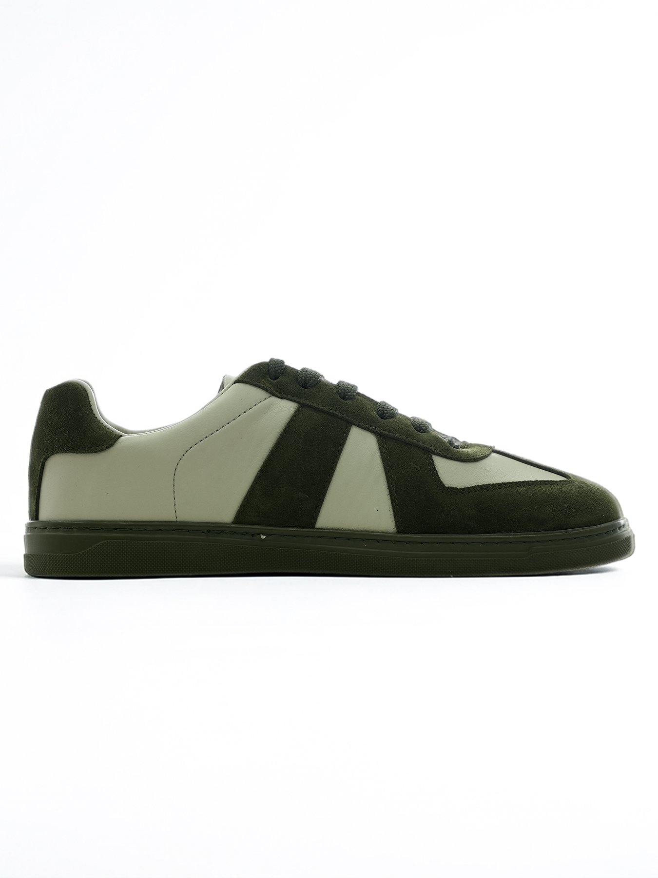 Kalitenin her detayda hissedildiği bu modelde, pürüzsüz hakiki deri yüzey, koyu haki süet panellerle zenginleştirilerek güçlü bir doku kontrastı oluşturulmuştur. Tasarımın imza niteliğindeki özelliği, süet detaylarla birebir aynı tonda tasarlanan koyu haki tabanıdır; bu detay ayakkabıya kesintisiz ve akıcı bir silüet kazandırır. Anatomik iç yapısı ve zemini kavrayan esnek taban teknolojisi, gün boyu konfor sunarak stilinizi destekler.